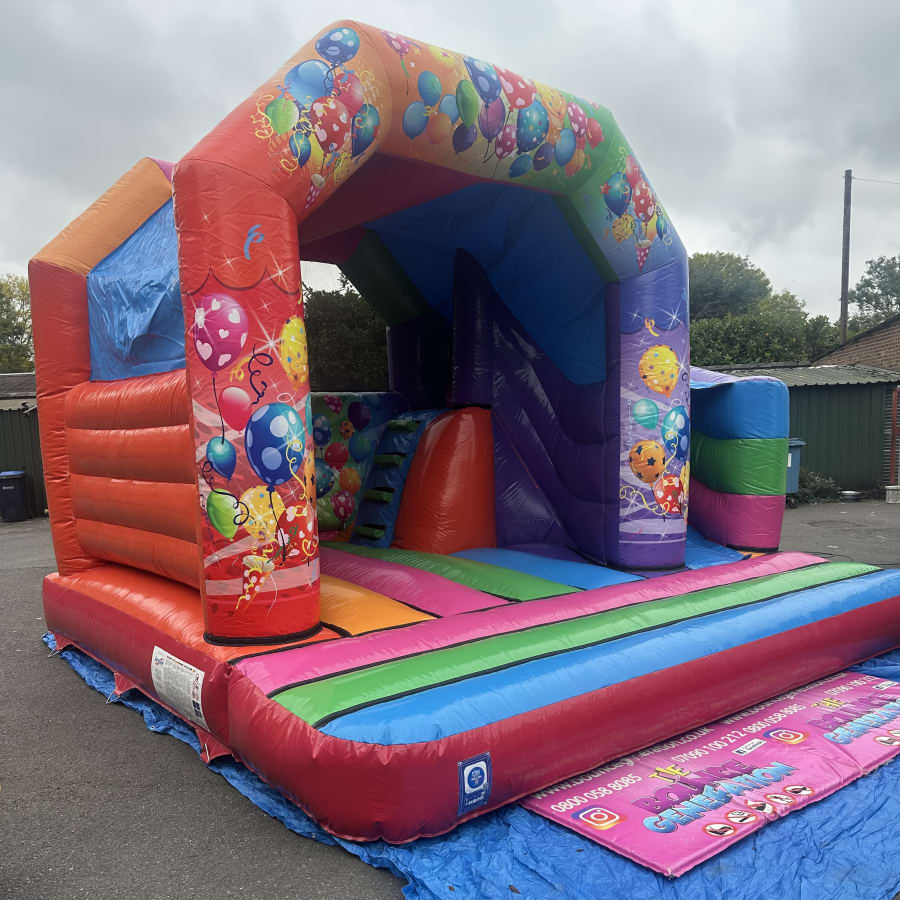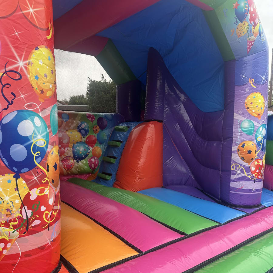 The Multi Coloured Party with 180 Slide is a vibrant, engaging bouncy castle with slide designed for maximum fun. Its wrap-around 180 slide expands the play zone, giving a large bouncing area plus an exciting slide in one unit. Bright party and balloon decals add atmosphere and make this bouncy castle a focal point for birthdays, community events and family gatherings.