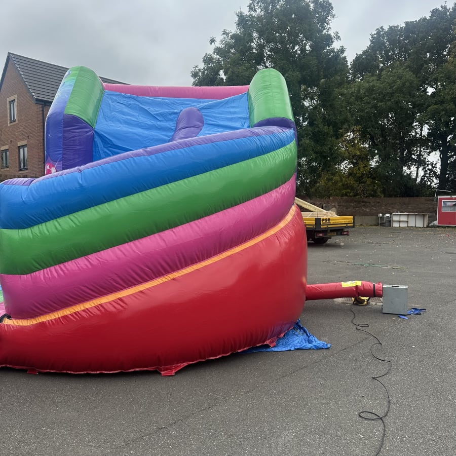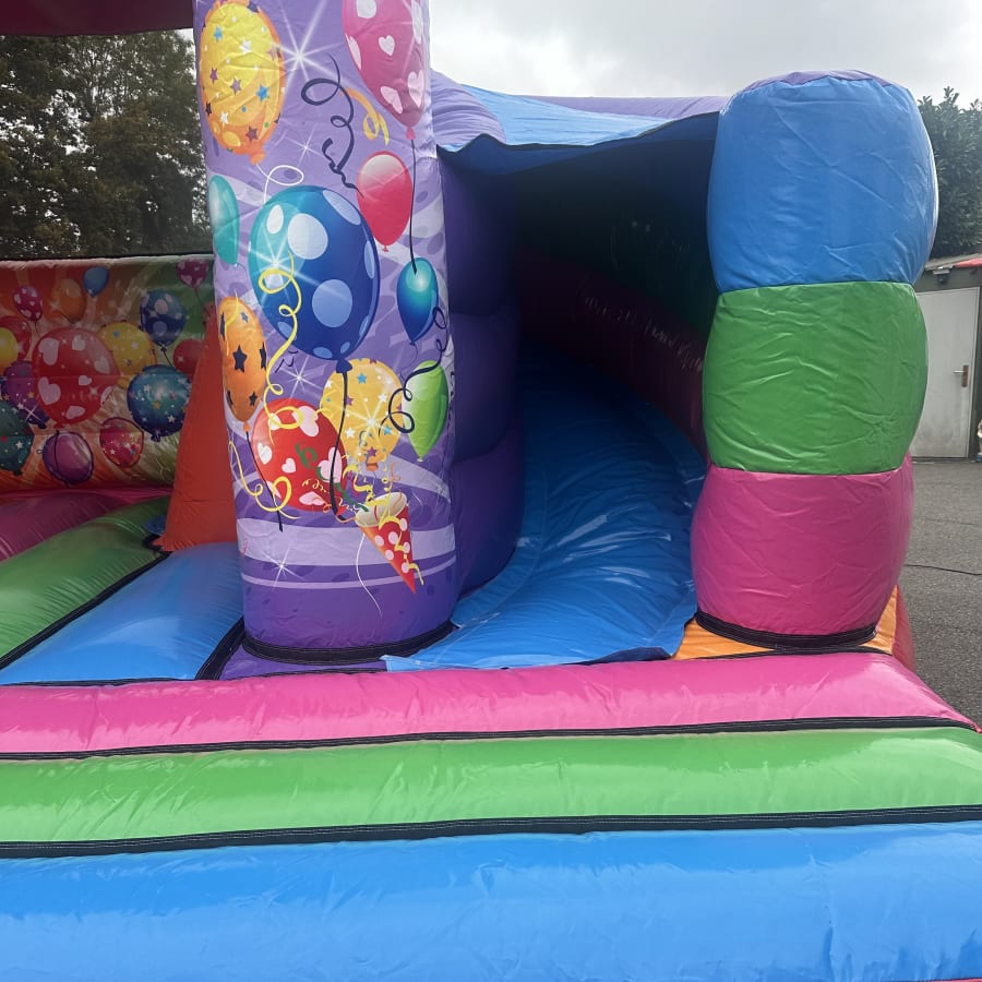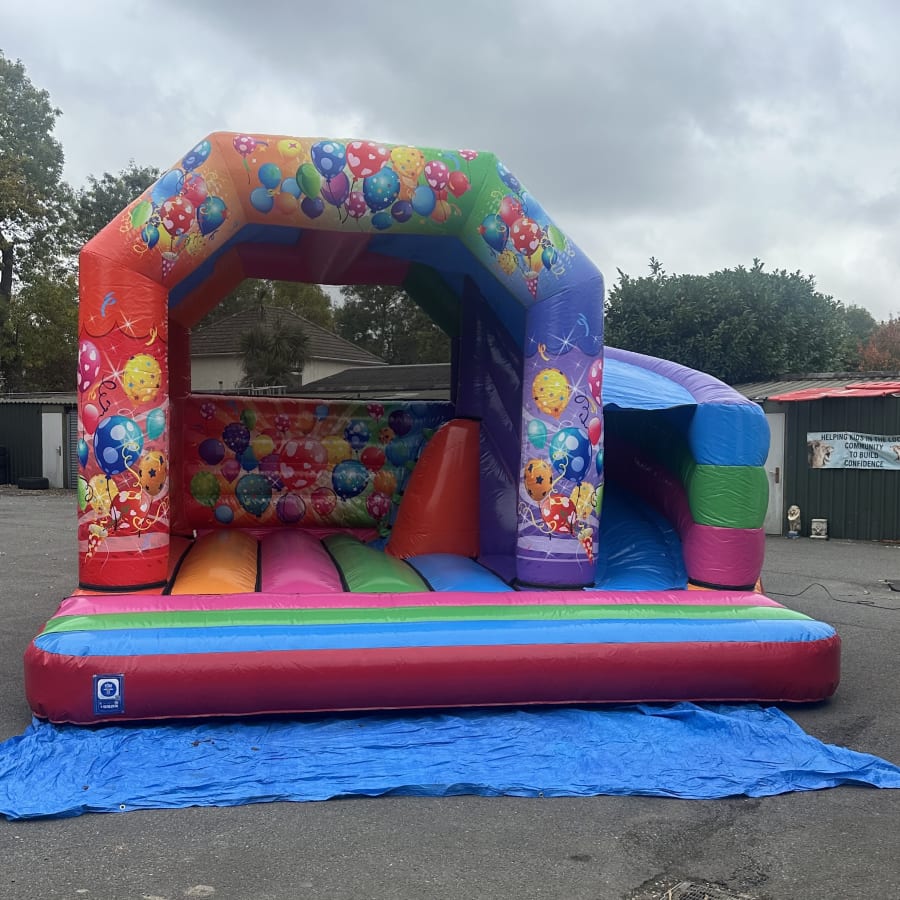 The Multi Coloured Party with 180 Slide is a vibrant, engaging bouncy castle with slide designed for maximum fun. Its wrap-around 180 slide expands the play zone, giving a large bouncing area plus an exciting slide in one unit. Bright party and balloon decals add atmosphere and make this bouncy castle a focal point for birthdays, community events and family gatherings.